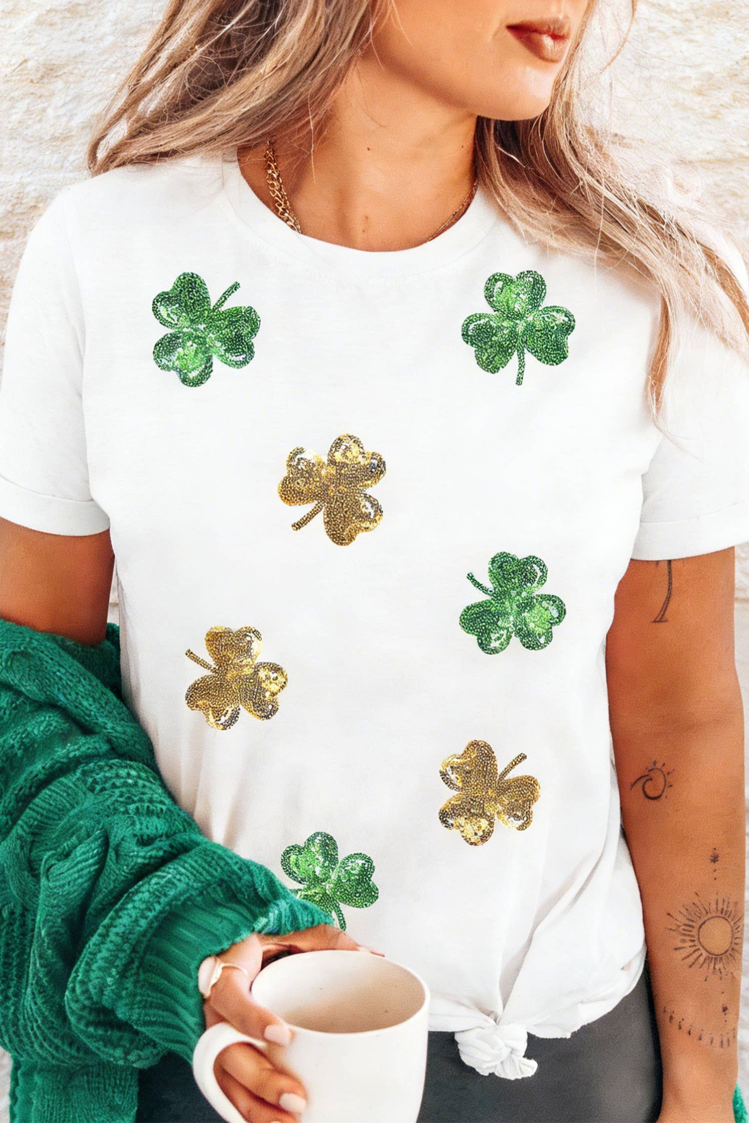 This Sequin Shamrock Shirt is your ticket to St. Patrick's Day fun. Covered in shimmering sequins that catch the light with every move, this tee transforms a classic holiday into a full-on sparkle fest. Whether you're hitting the parade, the pub, or just spreading good vibes, you'll be the most dazzling person in the room. Perfect for anyone who believes St. Patrick's Day deserves a little extra glitter and a whole lot of fun!